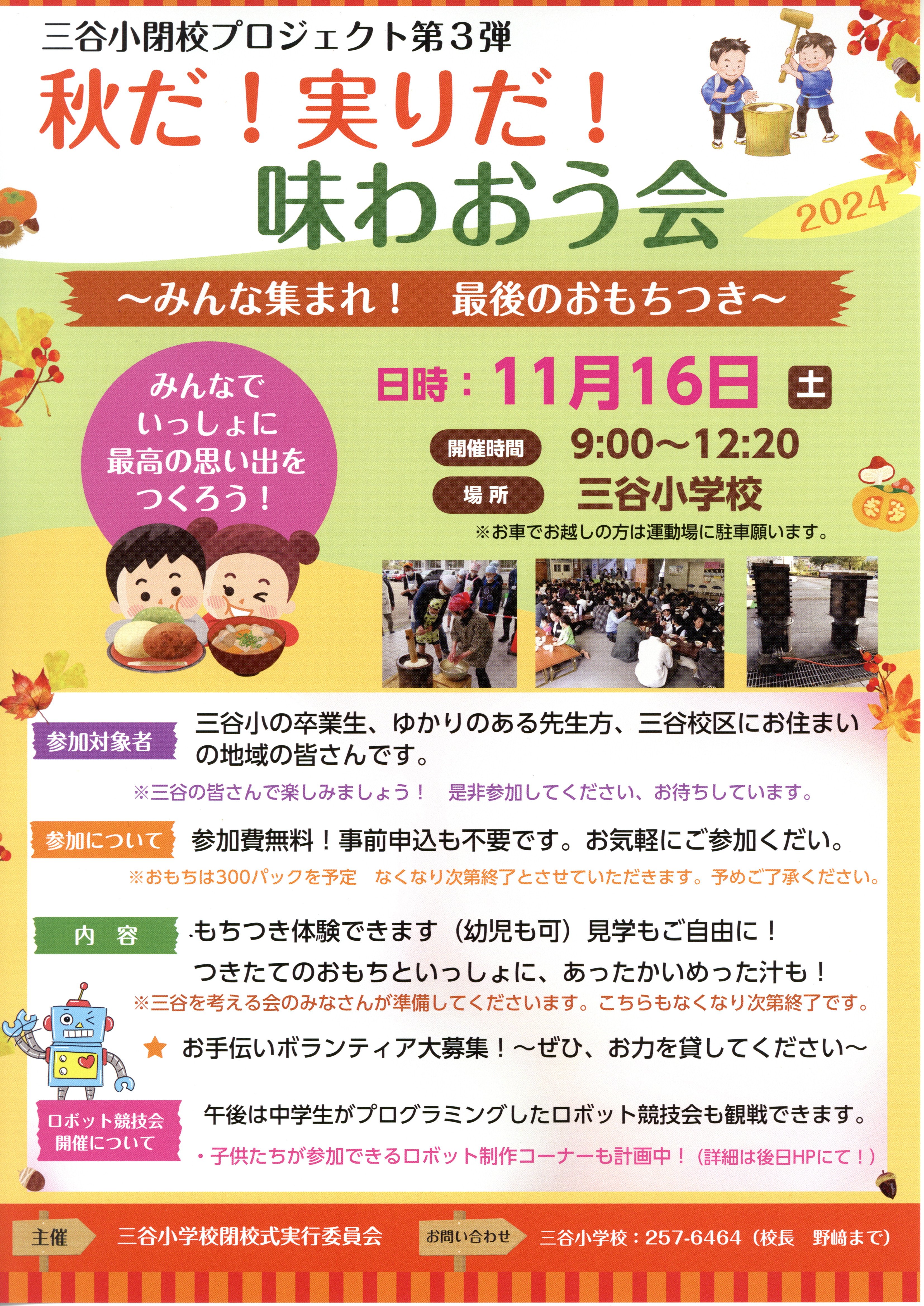 閉校プロジェクト第3弾として、恒例行事である「秋だ!実りだ!味わおう会」を拡大バージョンで、卒業生やゆかりのある先生方、地域のみなさんにもお声がけして開催する運びとなりました。日時は、11月16日(土)の9:00から12:20まで、会場は三谷小学校1階の多目的室です。事前申し込みは不要で、もちろんもちつき体験にも参加いただけます。詳しくは、添付のチラシでご確認ください。