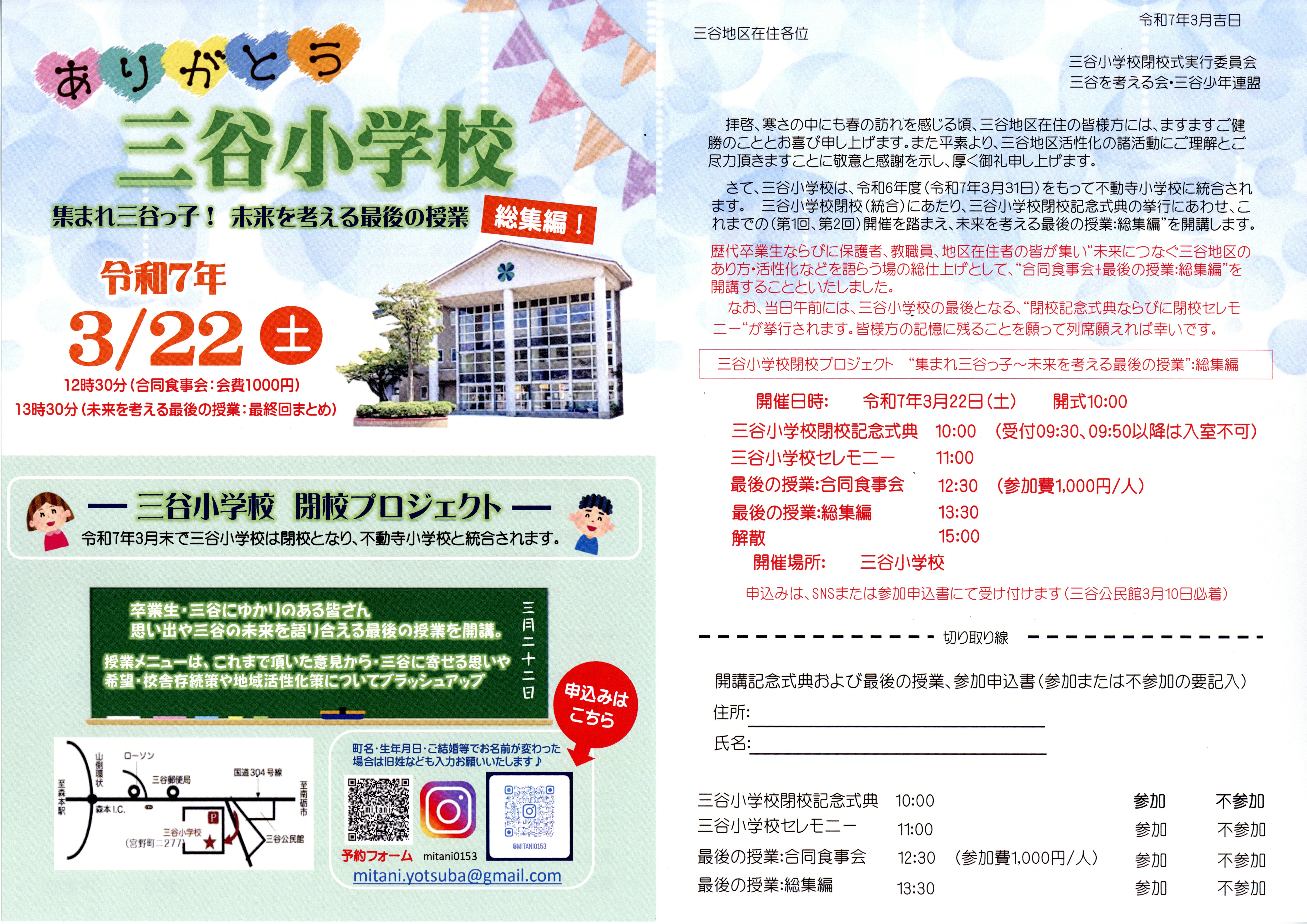 なお、当日午前には、三谷小学校の最後となる「閉校記念式典」および「閉校セレモニー」を挙行いたします。また、当日午後および翌日には学校開放も行います。思い出の校舎で、三谷小学校最後のひとときをゆっくり味わいながらお過ごしください。