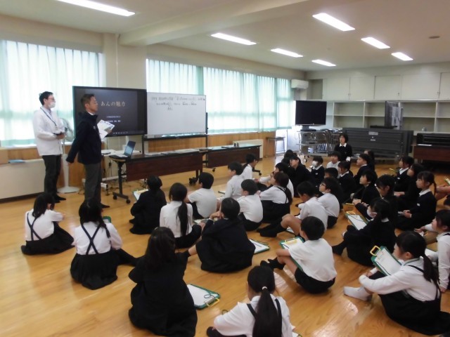 2枚目は、ゲストティーチャーとして製餡会社の真田さんと、なかざき生菓子店の中崎さんより、あんこの授業を行っていただいている写真です。