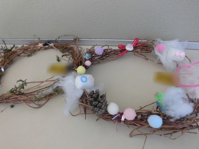 夏の間、たくさんの花を咲かせ、楽しませてくれたアサガオの蔓を使って、1年生がつくったリースがありました。
