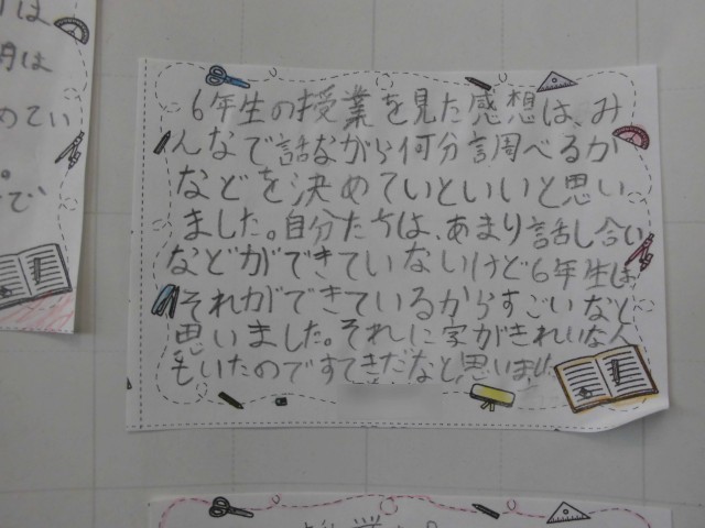 6年生の授業を見せてもらったお礼と感想を5年生が一生懸命に書いていました。