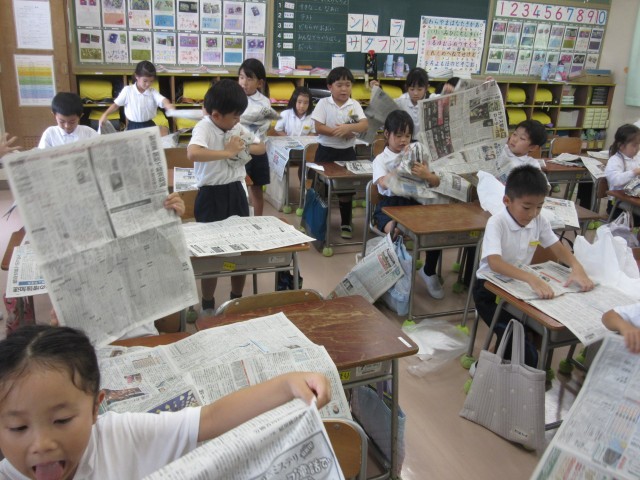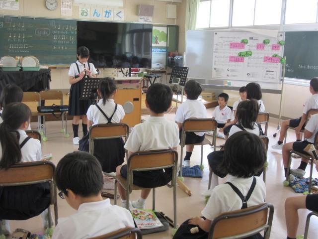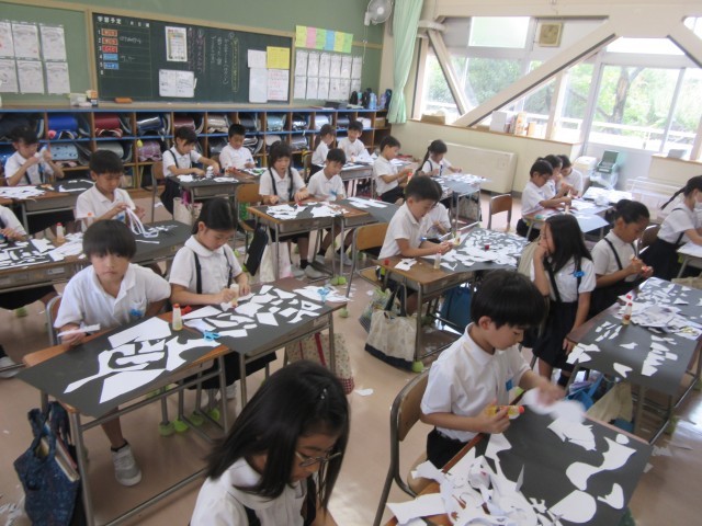 1年生は、新聞紙を使って「自分だけのボール」作りに取り組んでいました。「作りたい!」と意欲満々!あたってもいたくない、1人1個のお手製のボール。どの子も目がキッラキラでした!2年生は、図工で「白黒ワールド」を作っていました。紙を破り、お気に入りの形やおもしろい形を何かに見立てながら、黒画用紙の上に、思い思いに並べてみていました。「ほら、鳥だ!」「○○みたい」と言いながら楽しんでいました。3年生は、音楽の時間に、夏休みの課題だったリコーダー曲の聞き合い会をしていました。課題の3曲から1曲を選んで練習した成果を発表し合っていました。1学期にリコーダーの学習をスタートしたばかりの3年生、初心者とは思えないきれいな音色を響かせていました。夏休みにがんばって練習している子ども達の姿が目に浮かびました。
