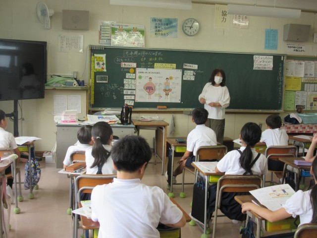 1年生は、国語の授業で、図書ボランティアさんによるお話会をしていました。本日は、詩や絵本、手遊び、お話の語り等バラエティーに富んでいました。1時間、集中しお話の世界を楽しんでいました。3年生は、英語で「好きなフルーツを英語で伝え合おう」の学習でした。どの子も堂々と明るい声で表現していました。4年生は、今、保健体育で、思春期の心や体の変化についての学びを進めています。今日も、養護教諭の熊木先生からの話をしっかりと聞きながら「人体ってすごい!」というつぶやきも出ていました。5年生は、体育でフットサルのゲームをしていました。6チームに分かれ、チームで声を掛け合いながら楽しんでいました。6年生は、デジタル科で、ドローンを操作していました。今日は「目的地までドローンをとばすことができるかな」の課題で、プログラムを組みやり直しを繰り返しながら楽しんでいました。また、昼休み時間は、休み時間の避難訓練を実施しました。予告なしでしたが、子ども達はしっかりと放送を聞き行動していました。