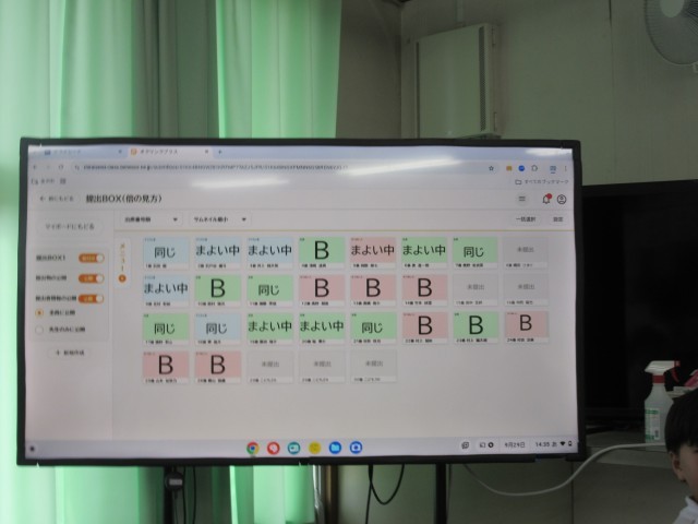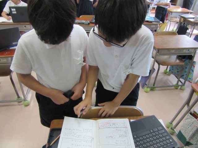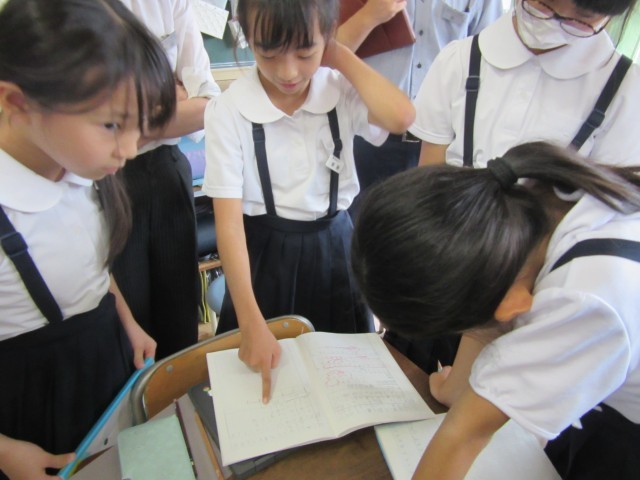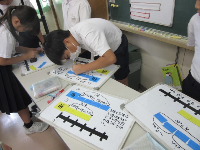 本日は、4年生の学級で「倍の見方」の単元の研究授業が行われました。本校では、全ての教員が1年に1回は、教育委員会等から助言者を要請し研究授業を実施し授業力向上に努めています。本時は、「もとの長さが違う時、どちらがよく伸びるかの比べ方を考えよう」でした。2種類の包帯を伸ばしてみたり、テープ図や数直線図にかいてみたり、計算で倍を求めたりしながら、どの子も一生懸命に考えていました。