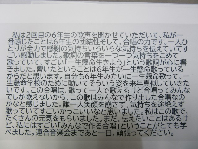 1週間前の「連音の曲を披露する会」の合唱は、自分たちが目指していたものに全く届いていなかったという振り返りを受けて、6年生は、ラストスパートの仕上げの練習を重ねて来ました。そして今日は最後の練習となりました。5年生がその姿を見に来ました。教室に戻った後、1人1人が6年生にメッセージを書き送りました。1人1人の感想を読ませてもらい5年生の受け止める力、それを6年生に伝える力に感動しました。「一番感じたことは6年生の団結性、そして合唱の力」「歌詞の言葉を一つ一つ気持ちを込めて歌っていて「一生懸命生きよう」という歌詞が心に響いた。響いたということは、6年生が一生懸命に歌っているから」「自分も6年生みたいに一生懸命歌って一生懸命学校のために動いてそういう姿を来年真似していきたい」「歌って1人で歌えるけど、合唱ってみんなでしか歌えないから、この歌はみんなで作り出した合唱」「誰1人笑顔を崩さず、気持ちを途絶えず歌っていてすごいかっこいいな。たくさんの元気をもらった」1人1人からのメッセージをしっかりと胸に刻み、明日は大きなステージで思い切り歌うことを楽しんできてほしいと思います!
