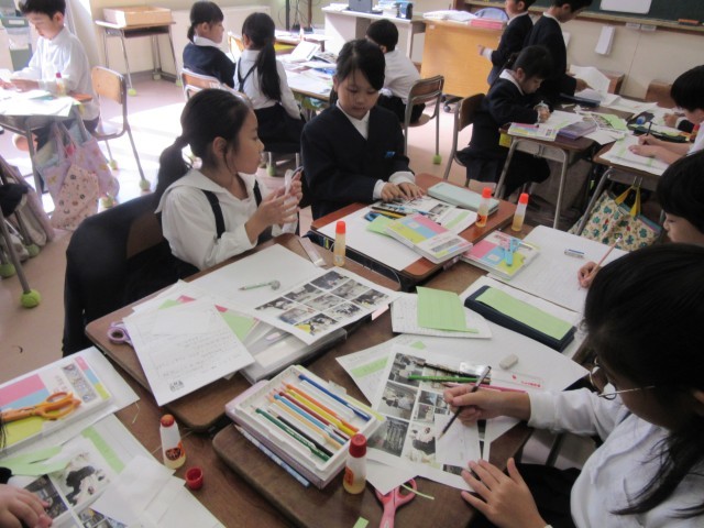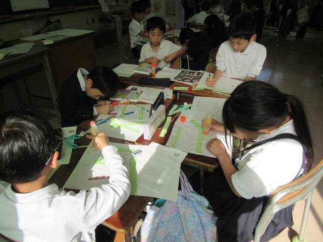 2年生は、昨日の探検で見つけたひみつを思い思いにまとめていました。同じところに行った人どうしでグループになっているので、忘れたことを確認したり、思い出しながら話をしたりしながら、意欲的に取り組んでいました。やはりほんものに触れる学習をさせてもらえた地域の応援団の力に改めて感謝です。