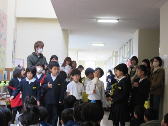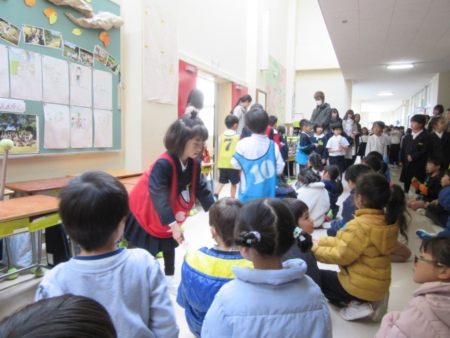 1年生は、生活科で「年長さんに楽しんでもらえるようにしよう」の気持ちで年長さんを秋祭りに招待しました。おうちの方や6年生には遊んでもらっていますが、今回は、来年の1年生ということで、自分達がお兄ちゃん、お姉ちゃんとして優しく対応し楽しんでもらうことをがんばりました。最初はお互いに緊張している様子でしたが、徐々に表情もほぐれ声も大きくなってきました。1年生、今日も貴重な経験ができました!