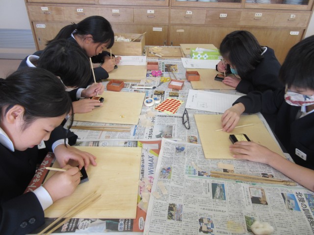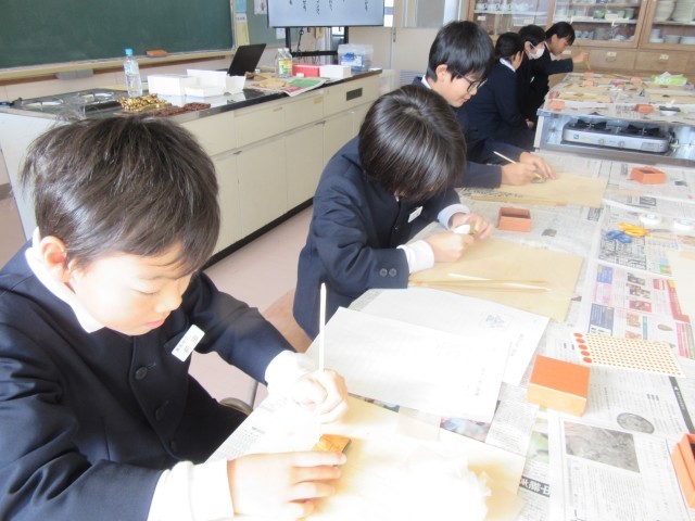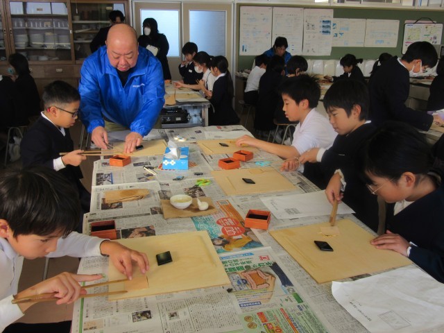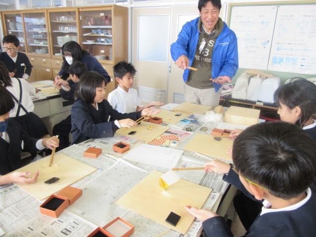 本日、4年生は、総合的な学習の時間の「伝統が息づくまち金沢」の学習で、金箔の箔張り体験をしました。金沢仏壇商工業協会の5名の職人さんが丁寧に教えてくださったので、安心して体験を楽しむことができました。世界に一つだけのブローチを自分の手で作ることが出来、子ども達はとても嬉しそうでした。また、金箔をきれいに張る難しさも実感することができました。金沢仏壇協会の皆様、貴重な体験をさせていただきありがとうございました。