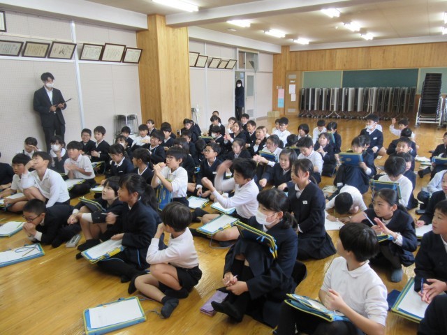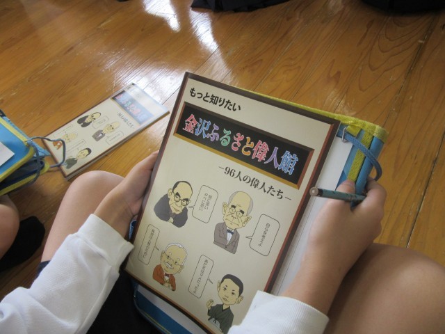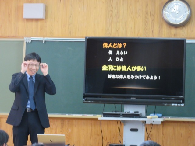 4年生は、総合的な学習の時間に、金沢出身の偉人について学びます。その導入として、金沢ふるさと偉人館より、学芸員の山岸さん(本校出身)に来ていただき、偉人館や10名の偉人についてお話を伺いました。寸劇を見ているようなお話に、参加者全員が引き込まれ、あっという間の1時間でした。子ども達の反応もとてもよく、1時間を通して、「知りたい!」「書きたい!」「考えたい!」気持ちが、全員の姿から感じられました。今後の総合的な学習の時間に、自分の興味を持った偉人について調べ学習を進めます。ふるさと偉人館は、現在は3ヶ月間工事中で、12月20日から再開館されるそうです。今年度は、秋の遠足では訪問できなかったので、再開館の際には、ぜひ親子で訪問し見学していただければと思います。