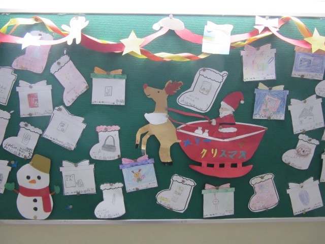 もうすぐクリスマス!クリスマスと聞くだけで子供たちはワクワクです。クリスマスパーティーに向けて飾り付け準備、プレゼント交換のカード準備、クリスマス会でべっこうあめ作り、そして、校内のいたるところはクリスマスに向けて作成した「こんなプレゼントがほしい!」の掲示物が。読んでみるとほんわかとあったかい気持ちになります。
