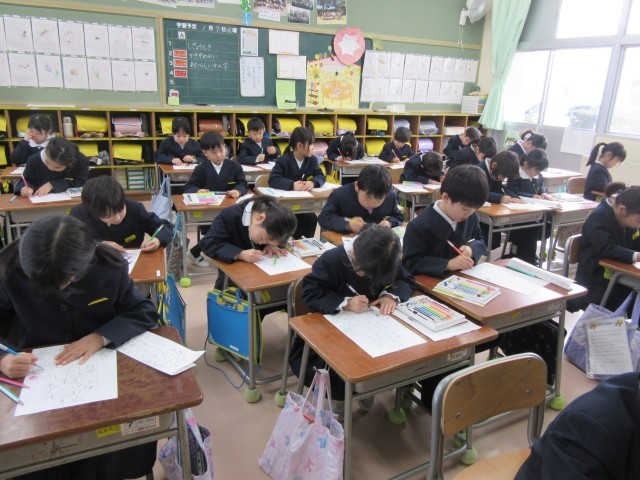 本日から3学期がスタートしました。2.3限目の時間に、全校一斉に書き初め会を実施しました。5年生はプレールームで、6年生は体育館で、学年合同で行っていました。どちらも「春の海」の曲が静かに流れる厳かな雰囲気の中、心を込めて集中して取り組んでいました。1~4年生は、それぞれの教室で行っていました。どの学年の子供たちからも、今年1年を良い年にしたいという前向きな気持ちが、真剣な姿や心を込めた字から強く感じられました。