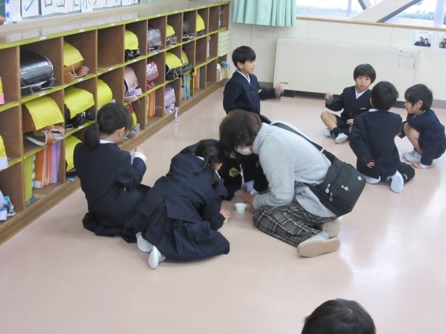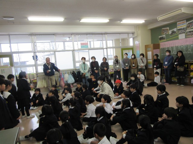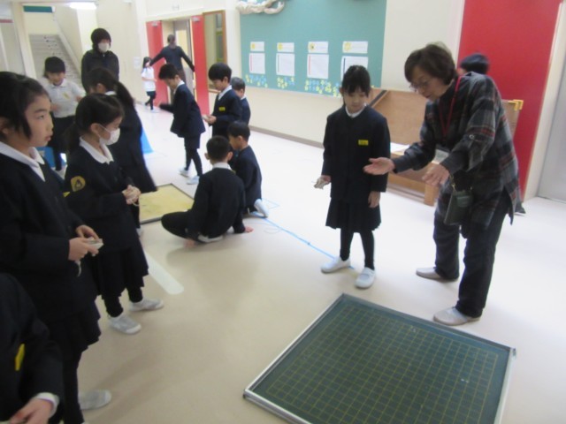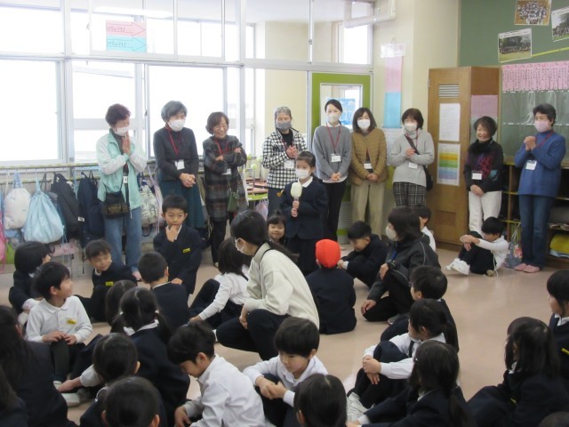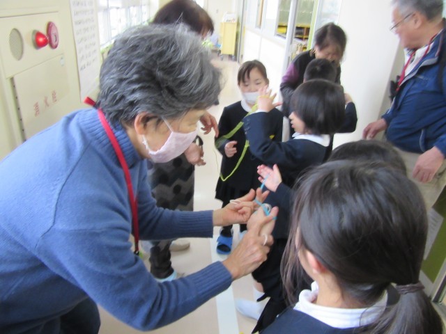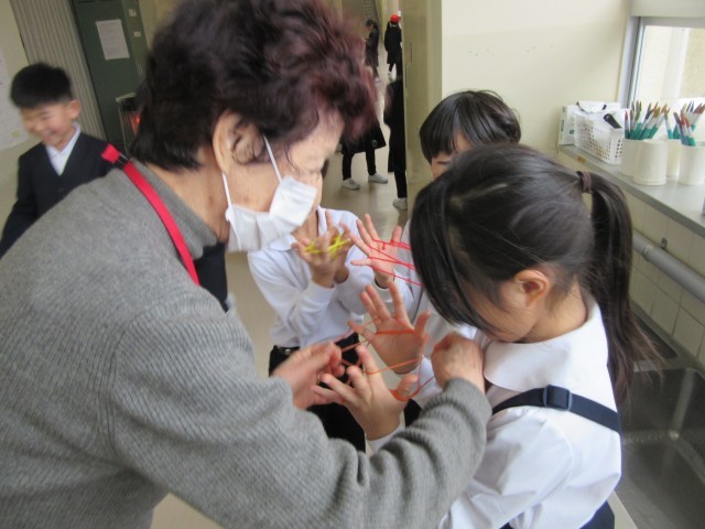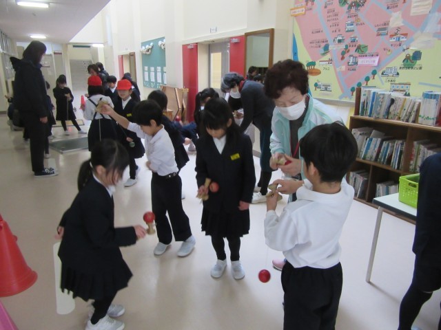 本日は、1年生生活科で「昔遊びの会」として、地域の方と遊ぼうの会が実施されました。本校では初めての企画でしたが、会の趣旨を理解してくださった11名の地域の方が参加してくださいました。実行委員が中心となり会が進みました。子供たちは、おはじき、お手玉、けん玉、コマのコーナーに分かれて楽しんでいました。地域の方が持ってきてくださったあやとりもチャレンジできることになり遊びの幅が広がりました。「見て!」と何度もけん玉やお手玉の技を見てもらい「すごいね」と褒められにっこにこの子、コマのひもの巻き方や投げ方を手取り足取り教えていただき何度もチャレンジしている子、初めて、あやとりの遊び方を教えていただき慎重にやってみている子などなど子供たちの笑顔がいっぱいの充実した時間となりました。振り返りの会では「教えてもらって上手になって嬉しかった」「一緒に遊べて楽しかった」という感想がたくさん聞かれました。足元の悪い中、子供たちのためにご来校いただいた地域の皆様、本当にありがとうございました!