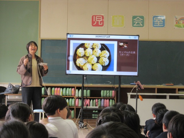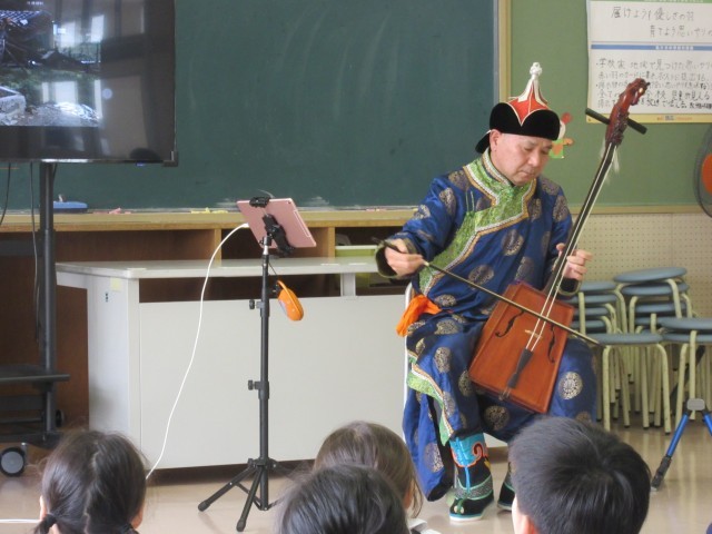 2年生は、国語で「スーホの白い馬」の学習をしています。そこで、今日は、モンゴル出身の中谷様にモンゴルの話をしていただき、岩尾様には、馬頭琴の演奏を聴かせていただきました。子供たちは、教科書に出てくるような服装や馬頭琴、そして本物の音色に目も耳も心も集中していました。本当に貴重な経験をさせていただきありがとうございました!