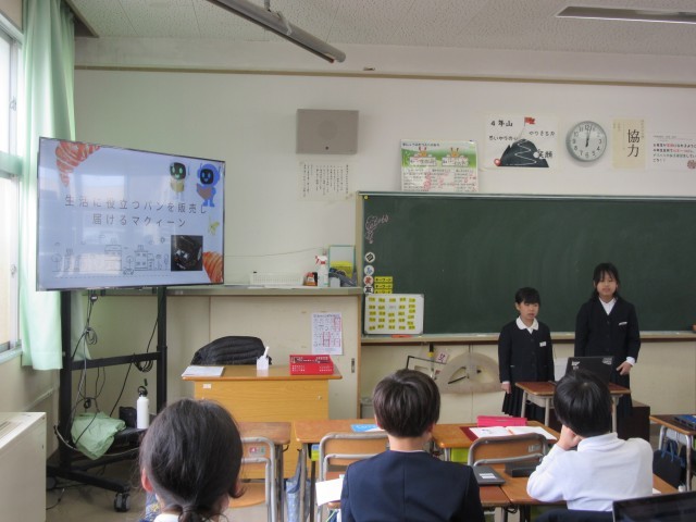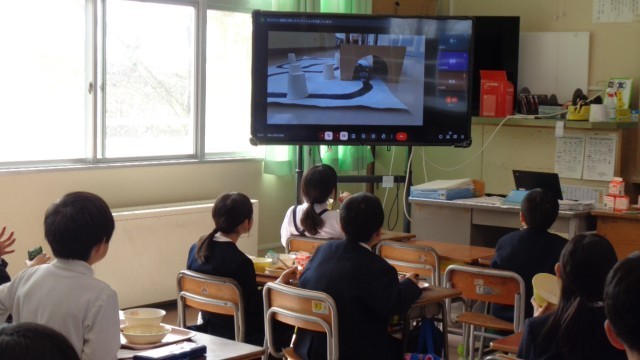 今週のお昼の放送は、学級ごとに行ったロボット発表会において各クラスで選ばれたロボットの動き等の紹介動画でした。先週行われていたロボット発表会を一部見せていただいたのですが、こんなロボットがあったらいいなをグループごとに考え、そのテーマに合う動きをプログラミングしたものを発表し合っていました。今日の紹介動画を見ながら「すごいな」「どうやったらこんな動きができるのかな」等と子供たちは興味津々の様子でした。