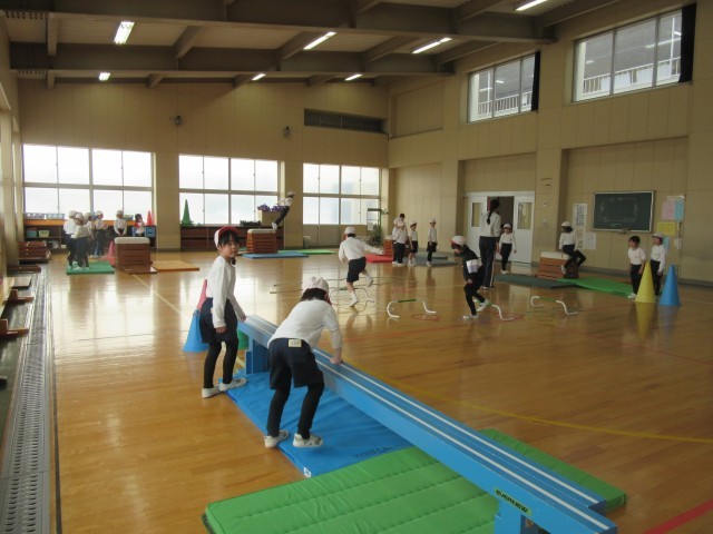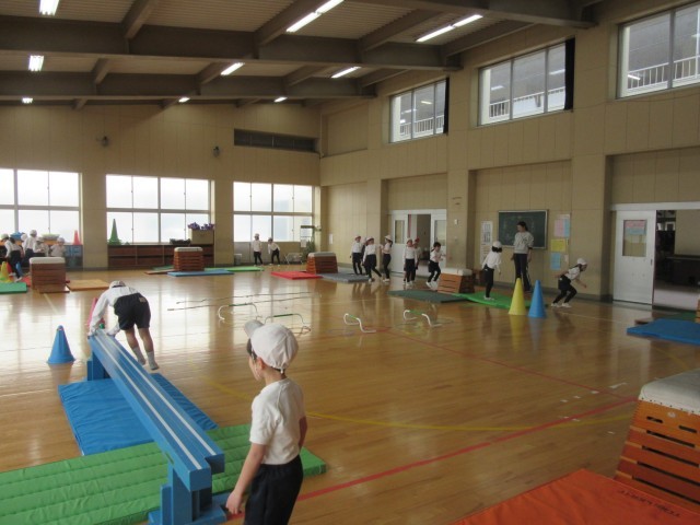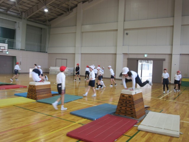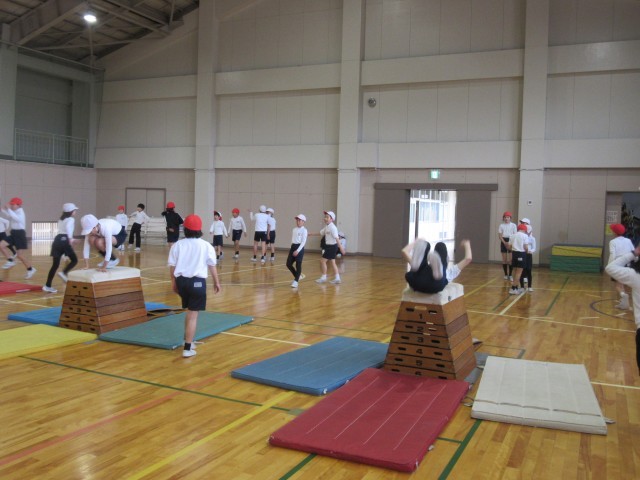 現在、体育では跳び箱運動をしている学年が多いようです。1年生は、跳び箱と言っても、ただ跳び箱を跳び越えるのではなく、「跳び箱を使った運動遊び」です。1,2年生は、様々な体育用の教具を使って、楽しみながら運動遊びをする中で、筋力、柔軟性、敏捷性、調整力などの体力を身につけます。自分なりの跳び方を工夫しチャレンジしながら「跳ぶ」運動を楽しんでいました。3年生以上になると、「跳び箱運動」となります。4年生は、自分に合う高さや場を選び、自分の目標を持って、台上前転、開脚跳び、閉脚跳び等の練習をしていました。