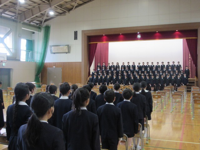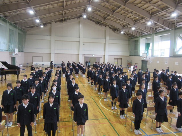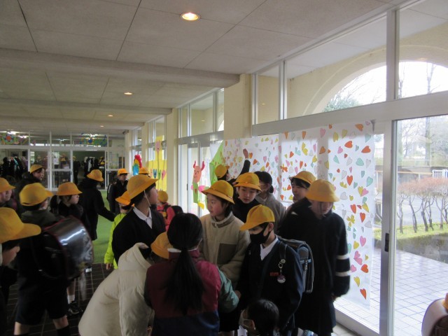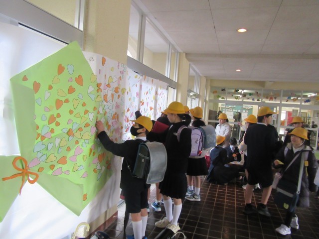 朝、5年生が、登校してくる在校生に「ご協力お願いします」と声をかけていました。何をしているのかなと近づいてみると、玄関ピロティの卒業生への大きな花束の掲示物の花びらを一緒に貼りませんかというお誘いでした。花びらは1~5年生が一人1枚ずつ作ったそうですが、花束が大きすぎたため、花びらを付け加えていたそうです。5年生だけでするのではなく、1~4年生にも声かけしている5年生のアイデアと行動力が素敵だなと思いました。授業では、1年生が体育の時間に、円形の段ボール崩しのボールゲームをしていました。どうやって守ればいいのかを考えながら動きを工夫し楽しんで動いていました。3年生は、英語の時間に、お話の続きを考え英語で発表し合っていました。楽しみながら生き生きと英語を話していました。そして、5、6限目は、卒業式のリハーサルでした。今日は、6年生89人が全員登校し、全員で式の流れの確認ができました。6年生はもちろん、5年生の意識もとても高く、すばらしい姿や歌声でした。本番は、3月17日です。どんな姿を見せてくれるのか楽しみです。