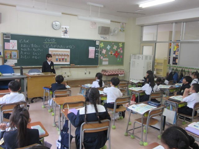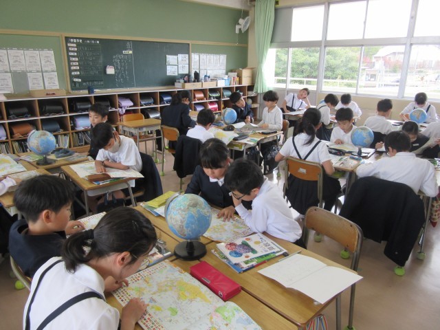 1年生は、算数で「どっちが多いかな」の学習をしていました。みんなが安心して学べるように、一斉に学習する際に大切にしたいことを確認しながら話し合いをしていました。前に出て説明している友達の話を集中して聞いている1年生、すばらしいです!体育では、バラバラの場所から2列に並ぶ練習を楽しみながらしていました。これもまた、すばやくまっすぐに並べる1年生に拍手です。3年生は、初めての社会の学習をしていました。どんな学習をするのか話し合い・確認しながら、楽しそうに方位記号の見方を学んでいました。4年生は、体育科でリレーのバトン渡しの練習をしていました。どんどんレベルアップすることを楽しんでいました。5年生も社会の学習でした。5年生は、世界地図を見ながら、経度・緯度の学習を楽しんでいました。