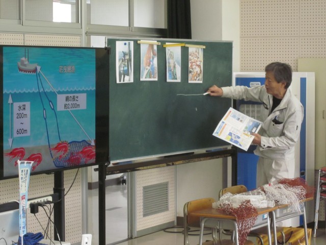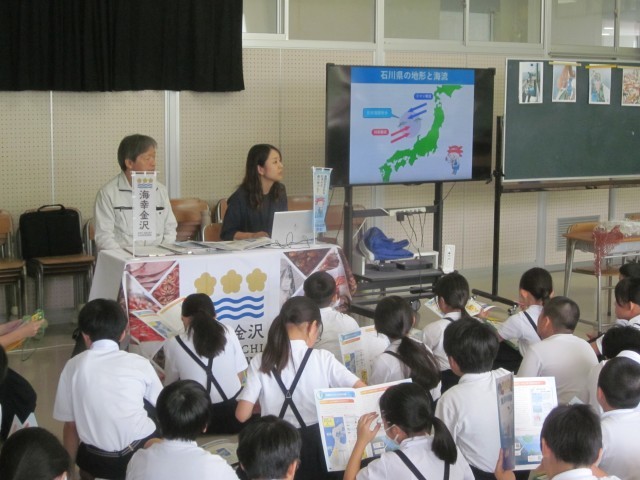 10月3日に5年の水産業出前授業がありました。鳥井漁業部取締役の鳥井淳二さん、金沢市農業水産振興課の出村さんをお迎えし、お話をお聞きしました。鳥井さんからは、漁師さんとして長年漁に出られた経験からたくさんお話していただいき、漁の仕組みや魚について学びが深まりました。子どもたちは、マスコットキャラクターの「さかなざわさちこ」さんも登場したり、クイズに答えたりしながら楽しんで学ぶことができました。ありがとうございました。