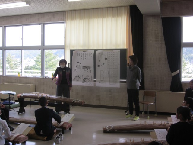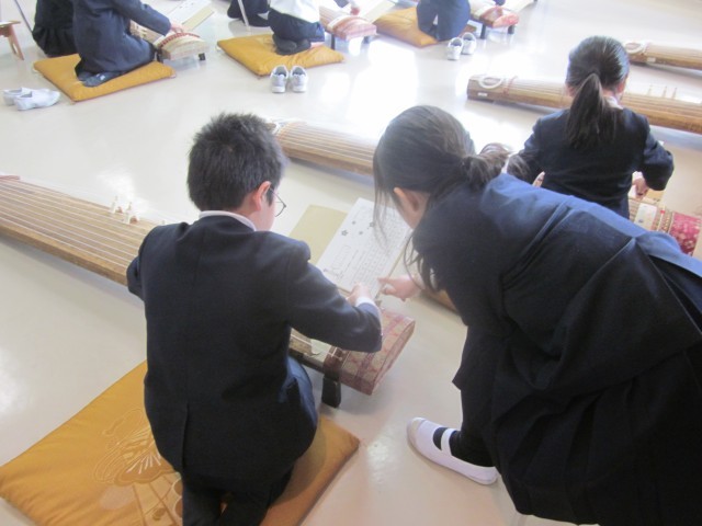 1月28日に、4年生は、音楽の和楽器の授業で筝体験を行いました。講師に須田先生、松村先生にお越しいただき、「さくらさくら」に挑戦しました。各クラス1コマ45分間でしたが、ペアで声を掛け合い協力して、最後まで演奏することができました。お琴の素敵な音色が響いていて、とてもいい時間でした。