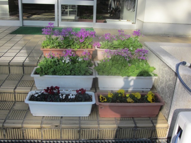 玄関の花から春を感じます。お祝い給食もおいしかったです。