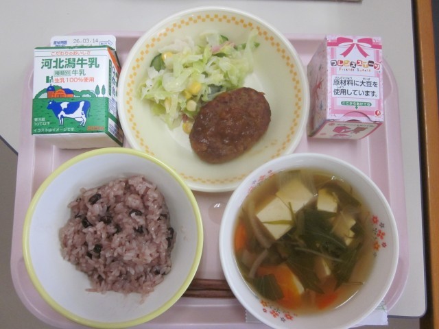 まだ肌寒い日もありますが、玄関に植えられた花が咲き始め、チューリップも芽を出し始めました。3月10日の給食は、お祝い給食で、お赤飯やハンバーグ、ケーキなどが出され、卒業が近づいてきていることを感じました。6年生も卒業式の練習を頑張っています。