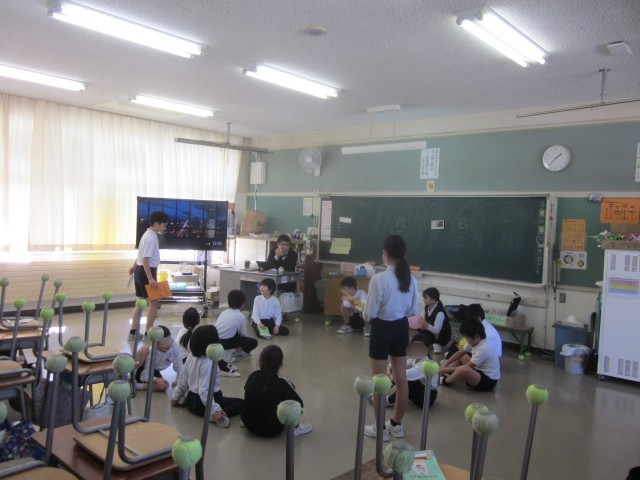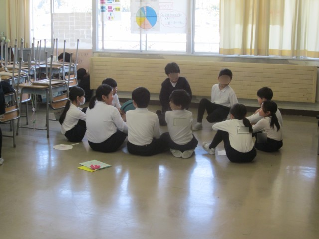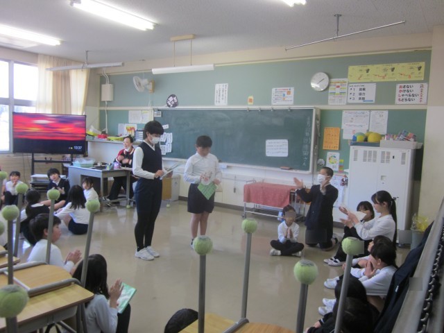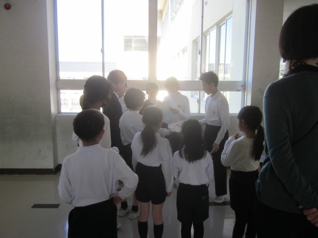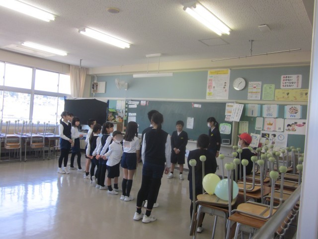 最後のたてわり遊びは、5年生を中心に運営し、4年生、3年生も進行のお手伝いをしていました。どの班も和気あいあいと楽しそうに活動する姿が見られました。遊んだ後に、今月の歌「ありがとう、6年生」を6年生に向けて歌い、最後にプレゼントを渡していました。6年生は、プレゼントを大切そうに抱えながら、班のメンバーに思いを伝えていました。温かな素敵な時間が流れていました。