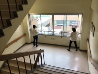 美化活動サポーターの方を中心に、32名で玄関まわりや教室、廊下など校内の窓拭きをしました。