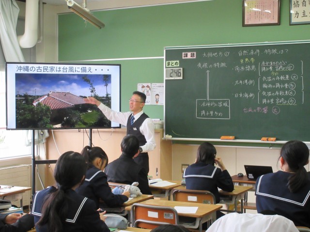 11月25日(火) 2年生社会科〈九州地方① 自然条件、特徴は?〉 公開日 2025/11/25 更新日 2025/11/25 学校日記 沖縄の屋根には、どんな特徴があるのでしょうか。沖縄でも結構雨は降るようです。それなのに「水不足」が起こるのは?どうも沖縄の地形と関係がありそうです。 +3