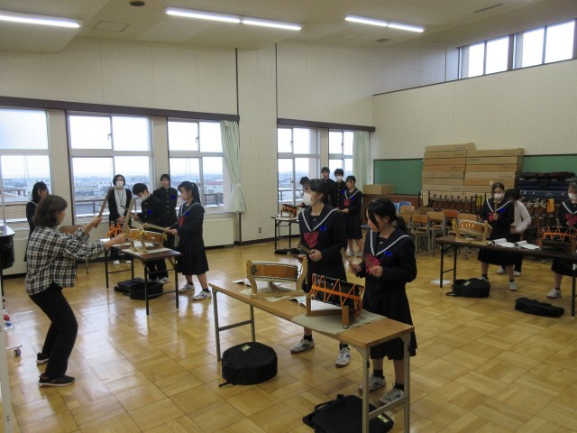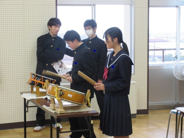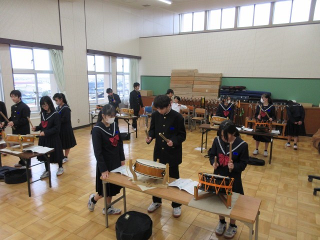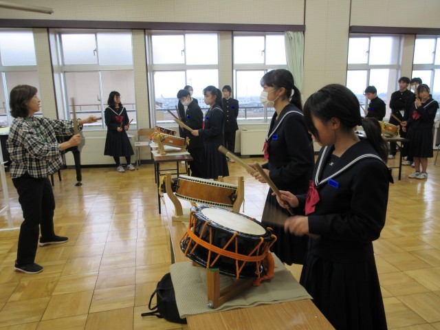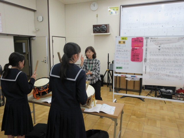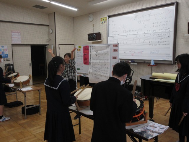12月8日(月) 1年生音楽科〈太鼓1と2を合わせて、音楽的な表現の工夫をしよう!〉 公開日 2025/12/08 更新日 2025/12/08 学校日記 太鼓2つが1セットで、それぞれのリズムが違います。アクセントをつけながら叩くことで、太鼓1と太鼓2が重なって、いい音色を響かせていました。 +3
