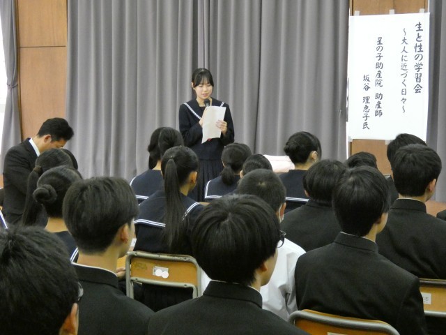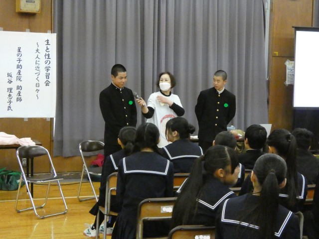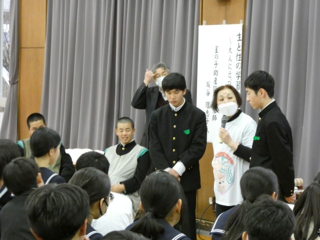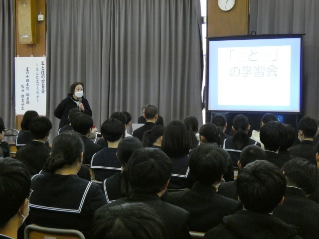 12月8日(月) 2年生 性教育講座 公開日 2025/12/08 更新日 2025/12/08 学校日記 本日、2年生の生徒とその保護者を対象に、「生と性の学習会~大人に近づく日々~」を開催いたしました。講師には星の子助産院の助産師、坂谷理恵子先生をお招きし、性教育についてのご講演をいただきました。後半の体験活動では、へその緒を通じた胎児の疑似体験や、妊婦体験用ジャケットの着用を行い、命の重みや身体の変化を肌で感じる貴重な機会となりました。 +4
