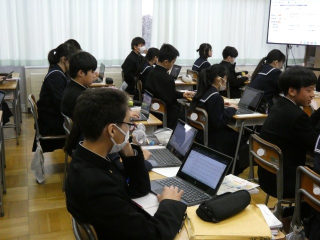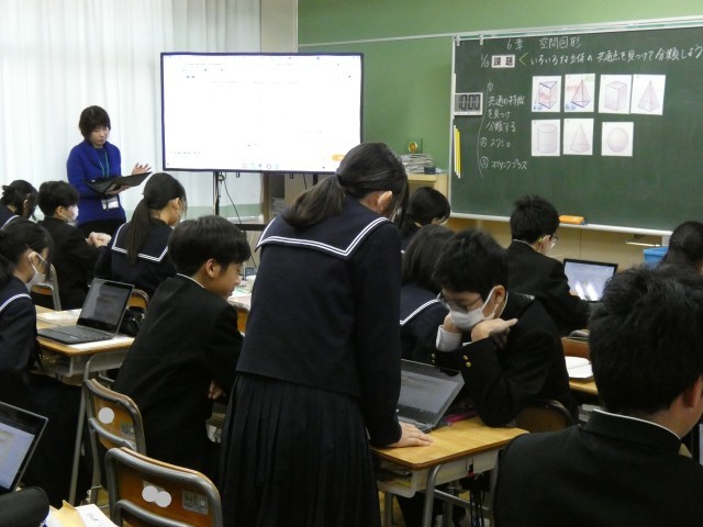 1月13日(火) 1年生数学 空間図形〈いろいろな立体の共通点を見つけて分類しよう〉 公開日 2026/01/13 更新日 2026/01/13 学校日記 本日、1年生の数学科において、さまざまな立体の共通点を見つけ出し分類する学習活動を行いました。底面や側面の性質、切断面の形状など、個人によって異なる分類基準がクラス全体で共有されました。図形を構成する要素に着目し、それぞれの立体の特徴を改めて整理する時間となりました。 +3