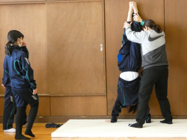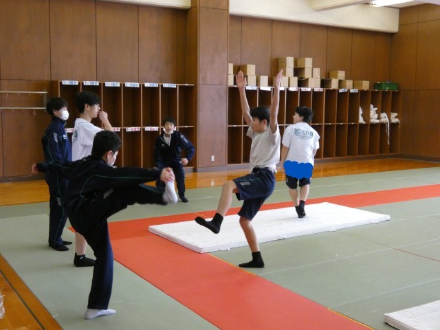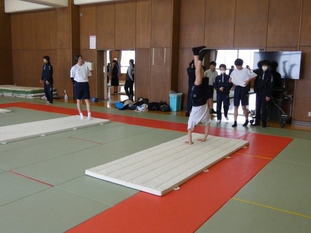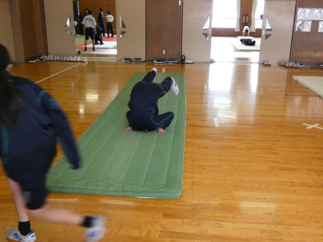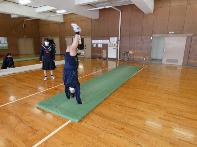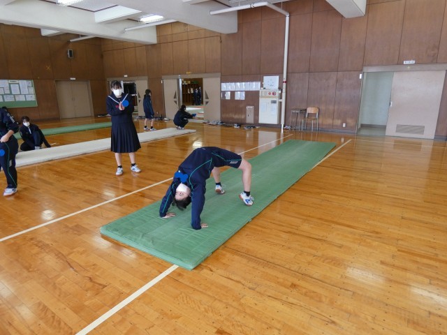 1月23日(金) 1年生保健体育科「マット運動」〈技の組み合わせを考えよう〉 公開日 2026/01/23 更新日 2026/01/23 学校日記 1年生の保健体育科では、現在マット運動に取り組んでいます。生徒たちは各自の習得状況に合わせ、さまざまな技を連続させる組み合わせを検討しています。一つ一つの技の完成度を高めるため、繰り返し練習に励む姿が見られました。 +5