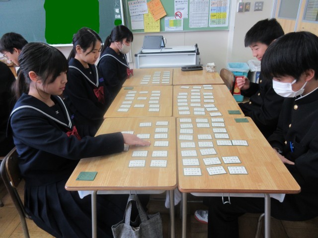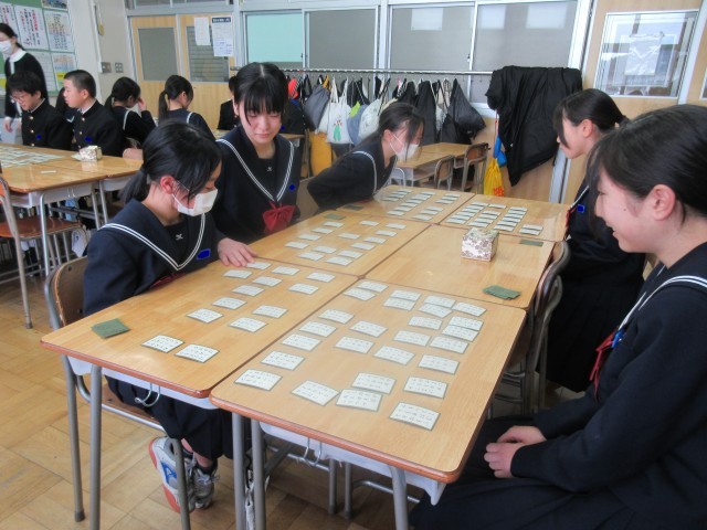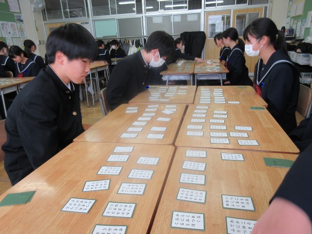 1月27日(火) 1年生国語科「百人一首」 公開日 2026/01/27 更新日 2026/01/27 学校日記 「百人一首」の練習をしています。上の句を聞いた時に、自信をもって取れる札はいくつありますか?札を並べたときに、自分が取れそうな札の場所を覚えておくこともできたらいいですね。まだ本番までは時間があります。じっくりと作戦をたててみるのもいいかもしれません。 +1