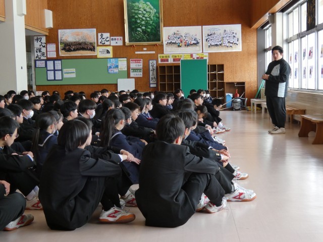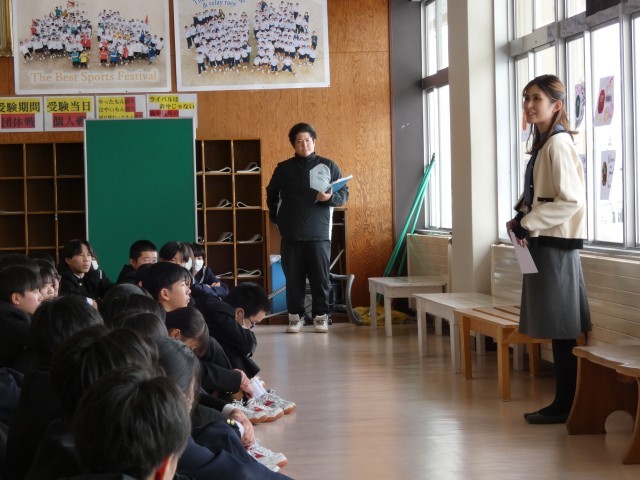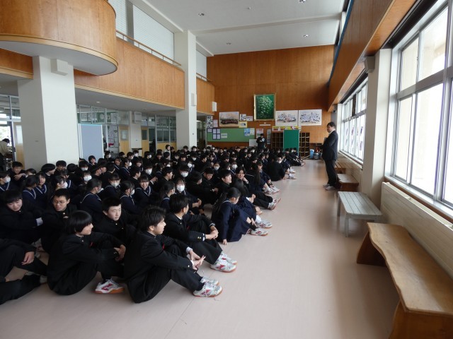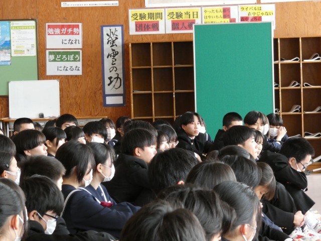 1月29日(木) 3年生私立入試事前指導 公開日 2026/01/29 更新日 2026/01/29 学校日記 本日、3年生の私立入試に向けた事前指導を実施しました。校長からの激励とともに、受験票の確認や試験会場での諸注意など、明日の本番に向けた具体的な説明が行われました。連日の降雪を受け、時間的な余裕を持った移動や事故防止についても再確認しています。3年生全員の健闘を期待しています。 +5