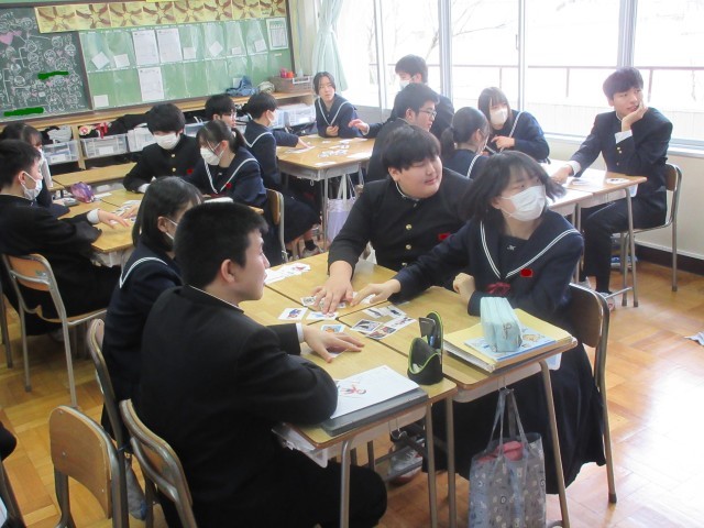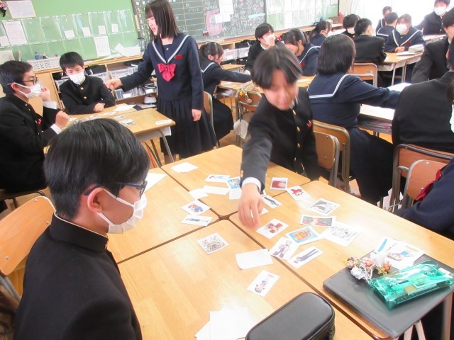 2月26日(木) 3年生英語科「かるた」 公開日 2026/02/26 更新日 2026/02/26 学校日記 まずナンバーを選びます。そして、そのナンバをめくるとメッセージが書かれています。そのメッセージを読み取って、目の前の絵が描かれたカード目がけて一直線に手を伸ばします。さあ、思い通りにカードをとることはできたかな。 +3