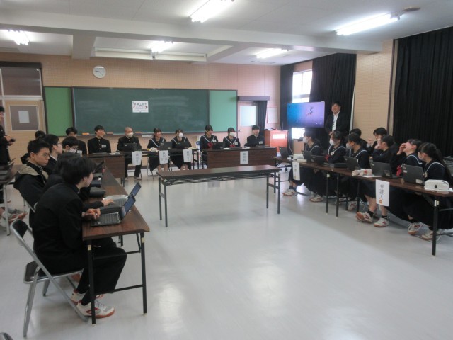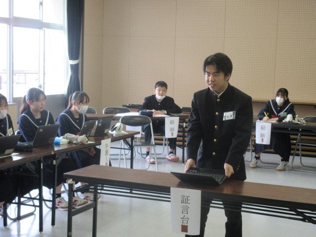 2月27日(金) 3年生社会科「模擬裁判」② 公開日 2026/02/27 更新日 2026/02/27 学校日記 「検察側」と「弁護側」の陳述は、よく考えられていました。その陳述に対する意見は、その場で考えなければいけないので、相手の話を集中して聞いている姿がたくさん見られました。最後の判決は、裁判官と裁判員の話し合いによって下されました。それぞれの役の人がしっかりとその責任を果たしていて、よい体験学習になりました。 +7