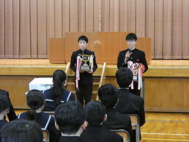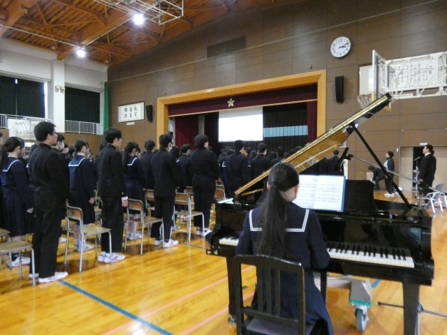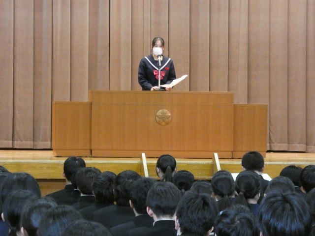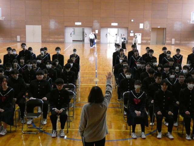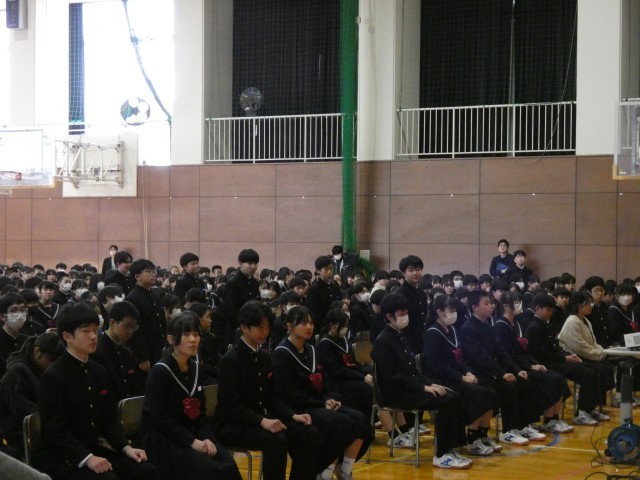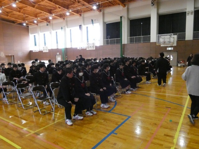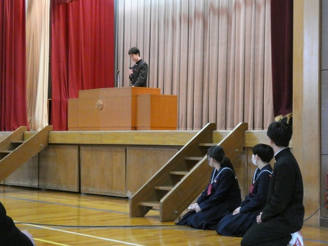 本日の6限目に全校集会を行いました。3年生は5限目の卒業式練習から2時間続けての活動でしたが、最後まで集中して臨む姿が印象的でした。