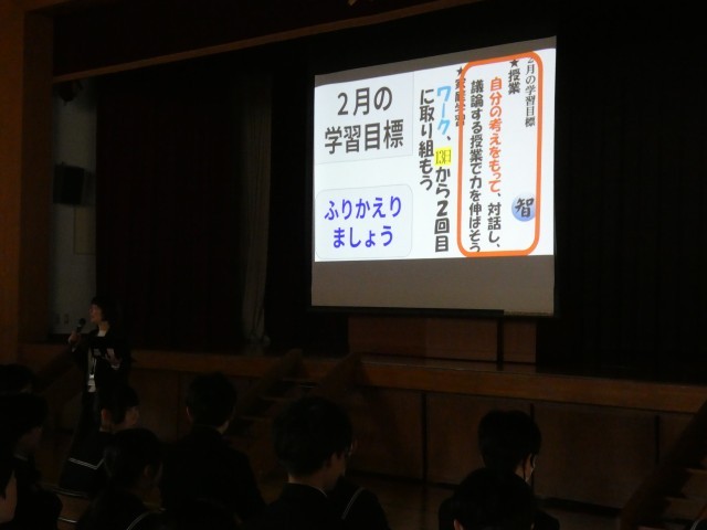 集会では表彰披露に続き、校長先生や各担当の先生から3月の生活・学習目標についてお話がありました。