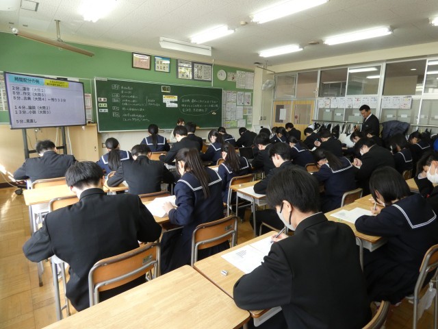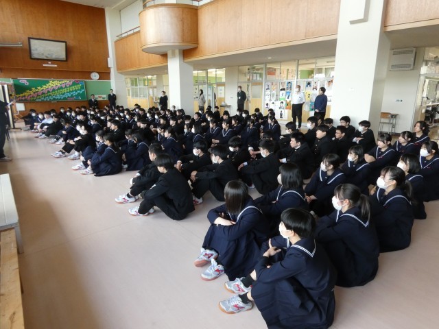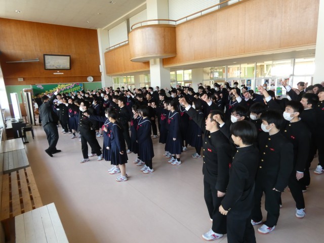 4限目の学年集会では、明日から始まる公立高校入試に向けて、校長先生の掛け声のもと全員で気持ちを一つにしました。