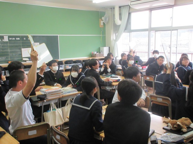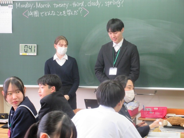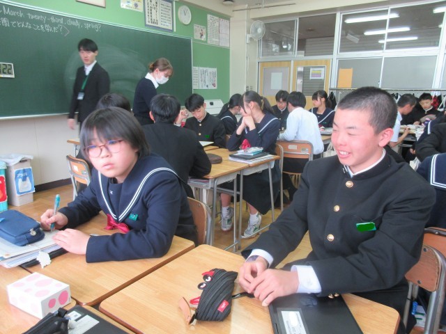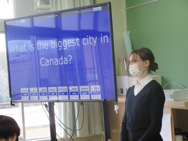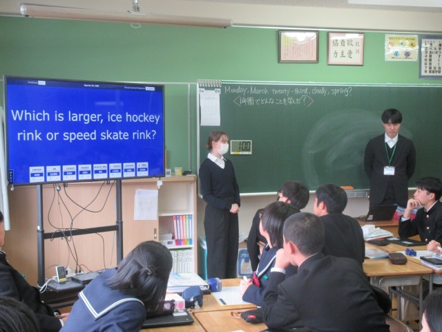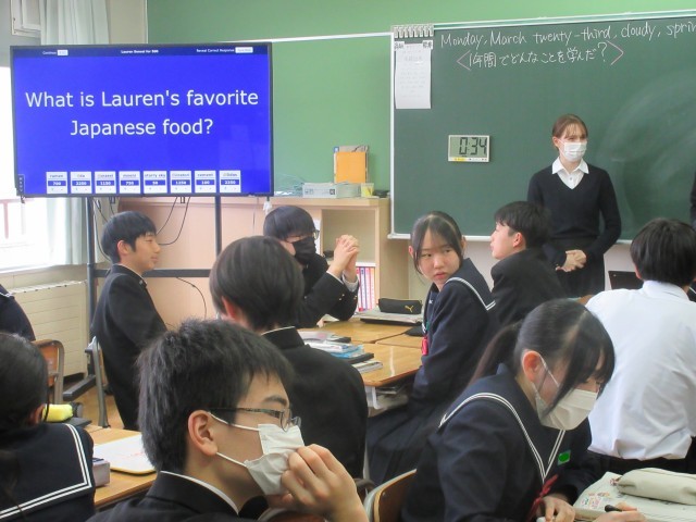 3月23日(月) 2年生英語科〈1年間でどんなことを学んだ?〉 公開日 2026/03/23 更新日 2026/03/23 学校日記 グループ対抗でクイズに挑戦しています。答えの「発音」はイメージできるけれど、スペルを書くのは難しいという問題もありました。ALTの先生の好きなJapanese Foodは・・・。いろんな具材をトッピングできるし、おいしいですよね。 +7