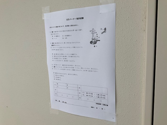 先生に話を聞くと「この試験に受かってもらわないと、実験ができないので…。フロア内のあちこちに貼ってあります。」とのこと。