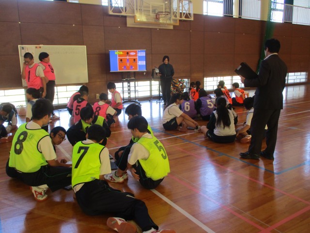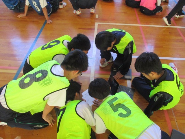 レシーバーがどのような役割を意識して動けばよいのか、そのためにはどんな力をつければよいのかをグループで相談しています。目的をもって行う練習には、それなりの成果がついてくると思います。考えた練習方法に粘り強く取り組んでみましょう。