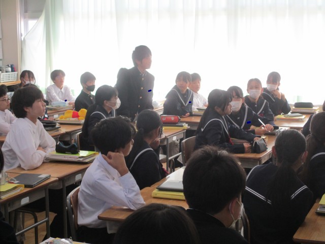 1年生が学年集会を行いました。前期リーダーの振り返りの感想から、1年生全体が中学生になってからの半年間で、大きく成長したことが伝わってきました。後期リーダーは、メリハリのある学年になりたいと力強く決意を述べてくれました。学年集会の最後には、明日の遠足のチェックポイントでの対応について確認もしました。