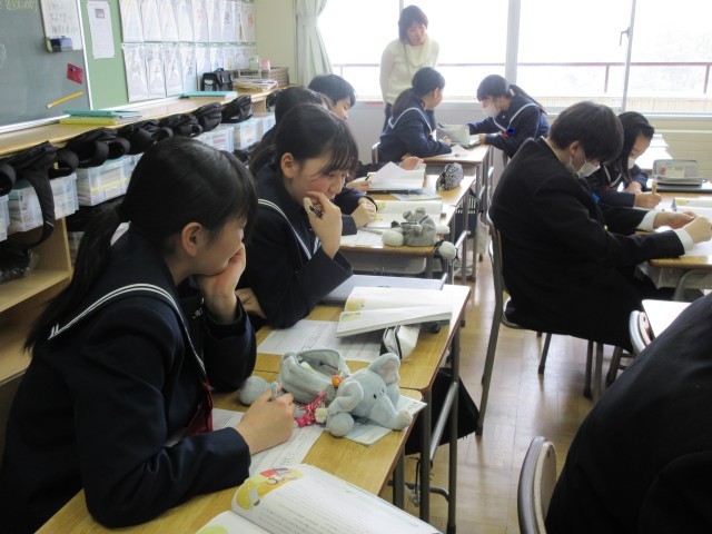 リーディングの課題に取り組んでいます。問題文の答えはどの文から見つけることができるのだろうか。それをじっくりと丁寧に探している雰囲気が教室内全体から伝わってきました。友達と相談しながら「自信」を深めている姿もとてもよかったです。これからも、互いに高めあっていきましょう。