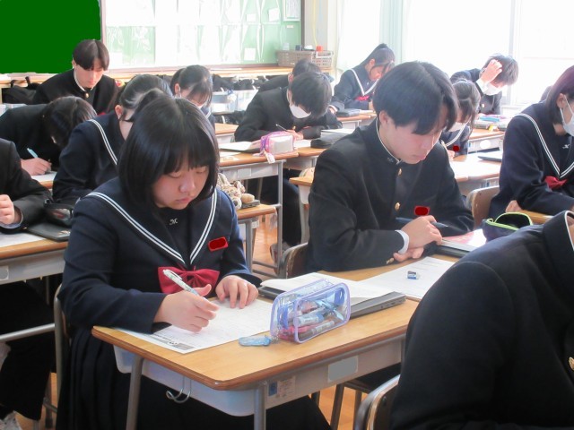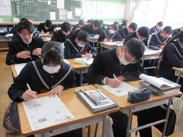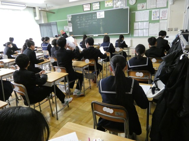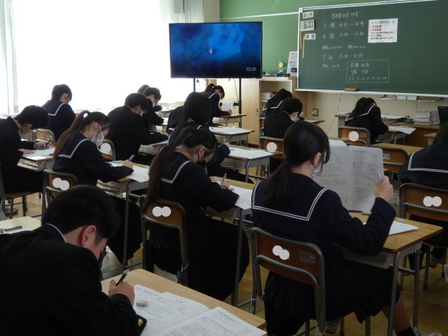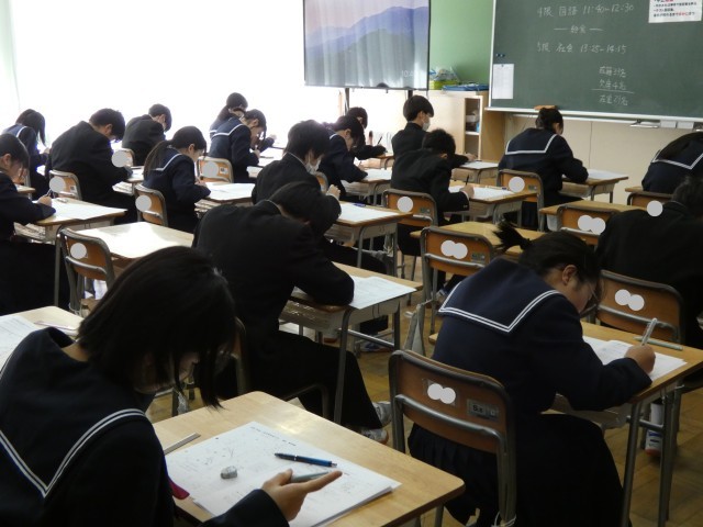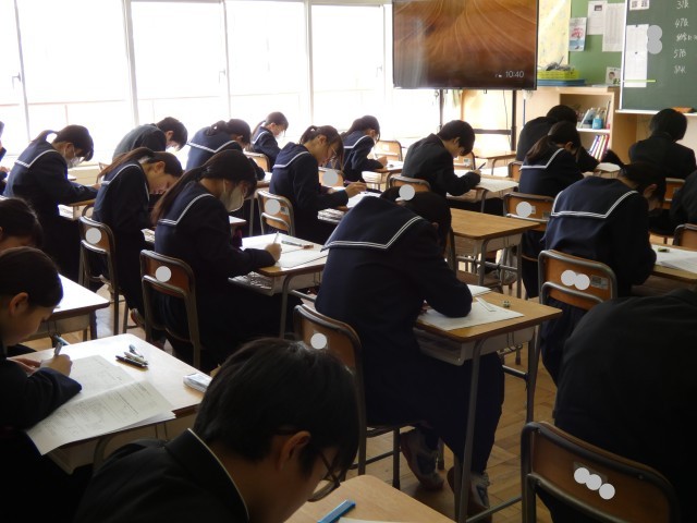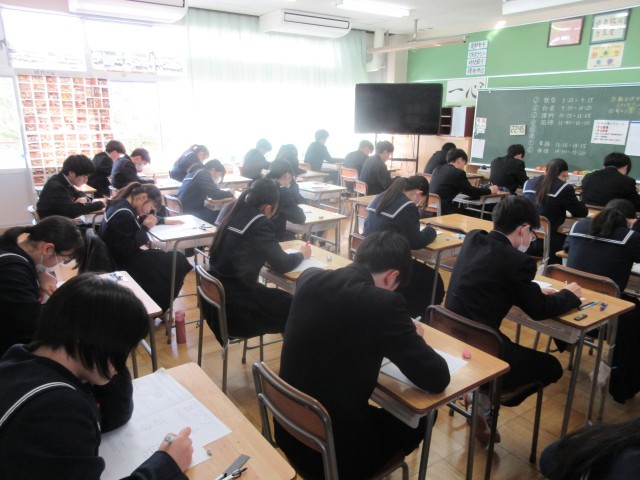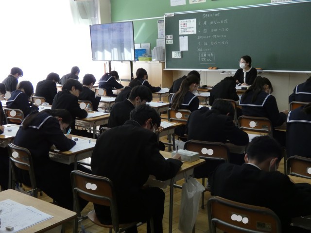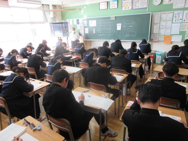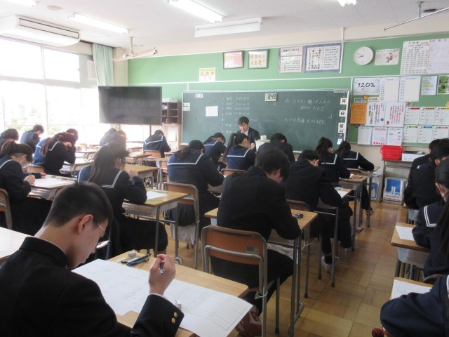教室にはピンと張り詰めた空気が漂い、生徒たちはチャイムが鳴る直前までワークやプリントを見直し、1点でも多くとろうと懸命に努力する姿が見られました。