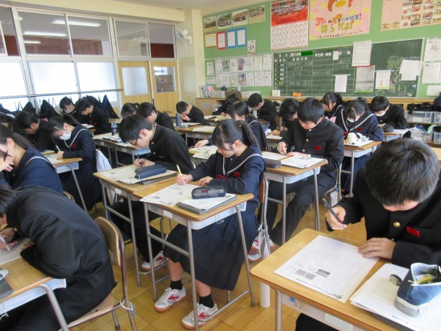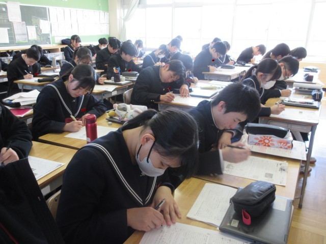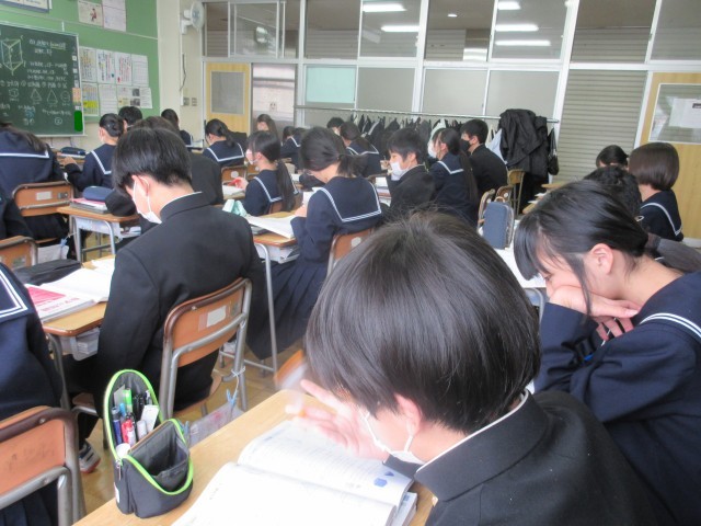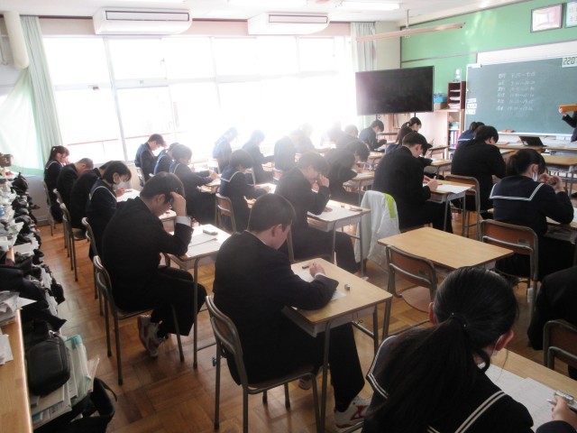 3年生にとって、最後の定期テストとなる「学年末テスト」が行われています。どの生徒も真剣そのものです。テスト後には、科目ごとに気になった問題を1つだけ思い出してみましょう。そして今日中に分かるまで復習してみましょう。それが、きっと自信につながります。