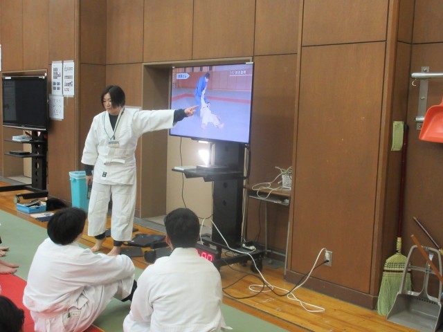 柔道の技「体落とし」の練習をしています。見本の動作を動画で見てから、実技に挑戦です。特に大事なのは、技をかける人が相手を投げたあと、相手の腕をしっかりとつかまえておくことでしたね。見てすぐにできるほど、技をかけるのは簡単なことではありません。お互いに集中して練習をしていて、とてもよかったです。