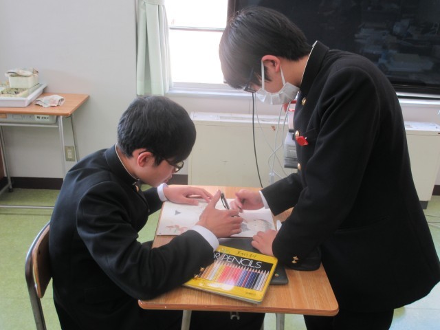 自画像の完成に向けてラストスパートです。自分の顔だけでなく友達の顔も描いている人も何人かいました。よく特徴をつかんでいてすごいと思います。毎日見るのは鏡に映った自分の顔なので、写真の顔はなんとなく不思議に感じます。そんなことありませんか?