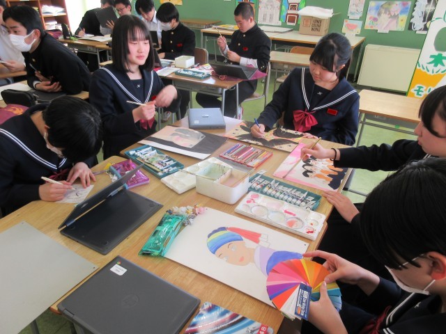 自画像を描いています。自分が思い描くイメージを存分に表出している感じがしました。真剣だけれど、楽しみながら描いている姿がほのぼのとしていて、とてもよい雰囲気でした。