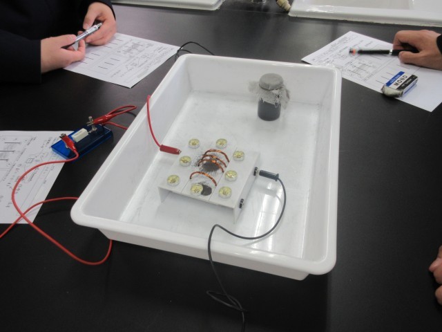 コイルに電流を流すと、磁界ができます。その様子を砂鉄を使って学んでいます。普段は磁界の様子は目で見ることはできませんが、砂鉄のおかげで確認できます。面白い模様をつくっていますね。